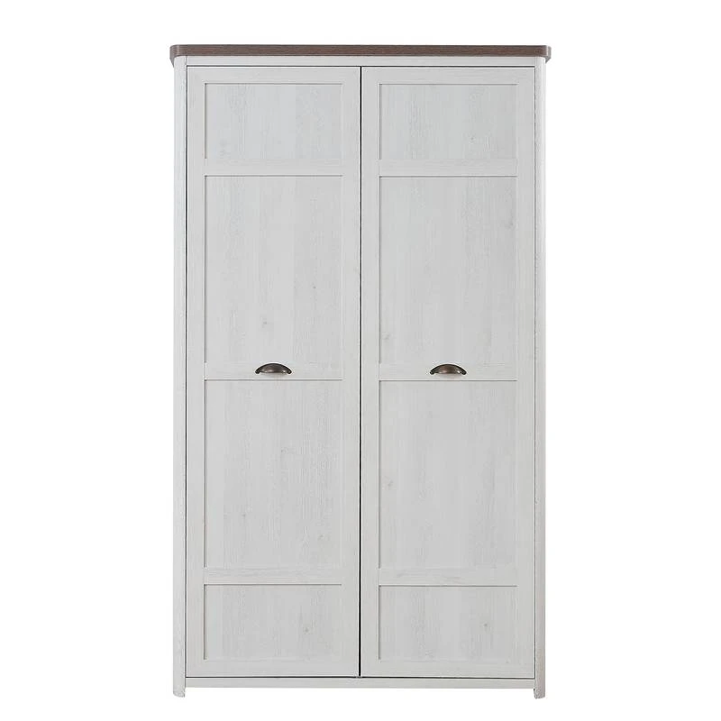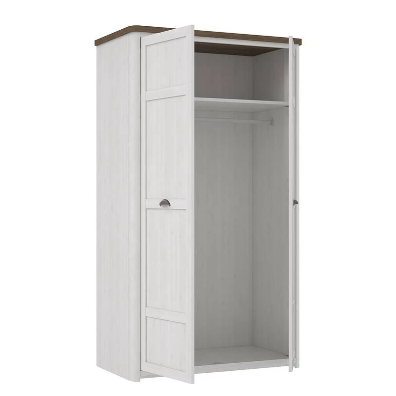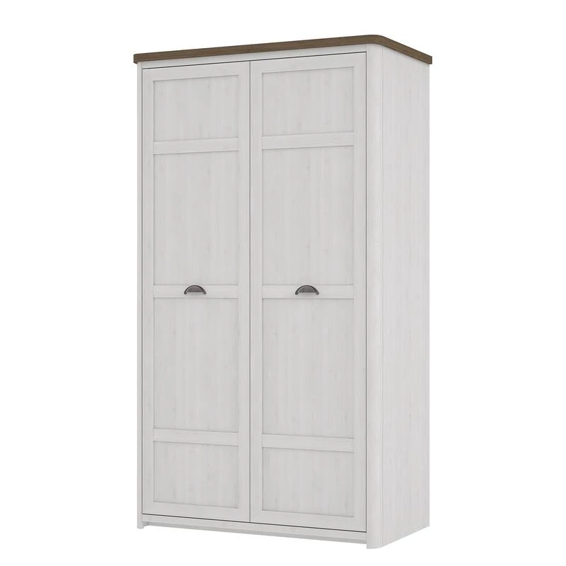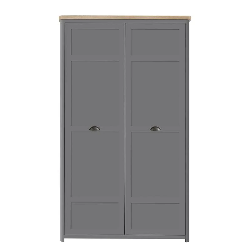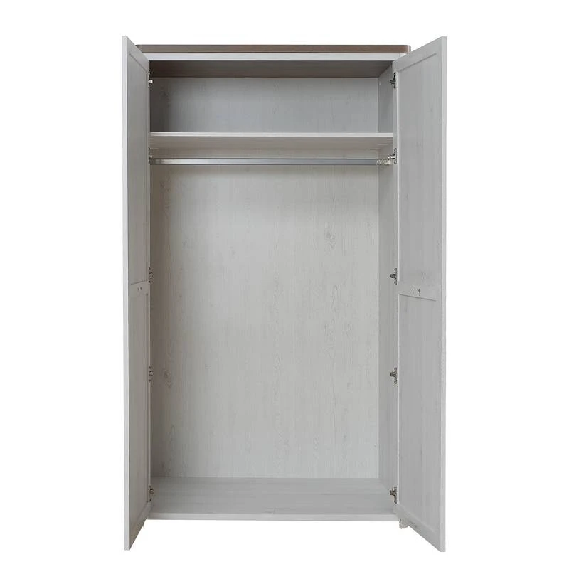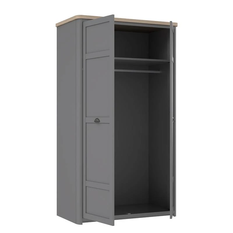 - Cette armoire fonctionnelle à deux portes s’intègre parfaitement dans la chambre à coucher, mais aussi dans d’autres pièces de la maison. Le décor gris et l’ornementation discrète des façades confèrent élégance et chic à l’intérieur.