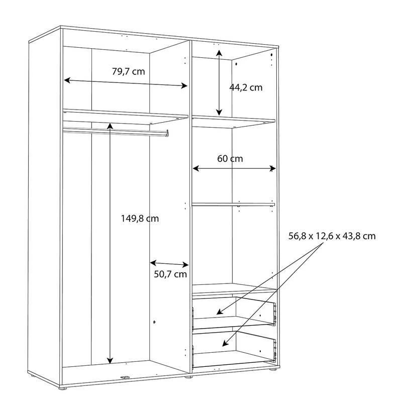 - Dimensions intérieures du tiroir : Tiroir, chaque : 56,8 x 19,5 x 43,8 cm (L x H x P)